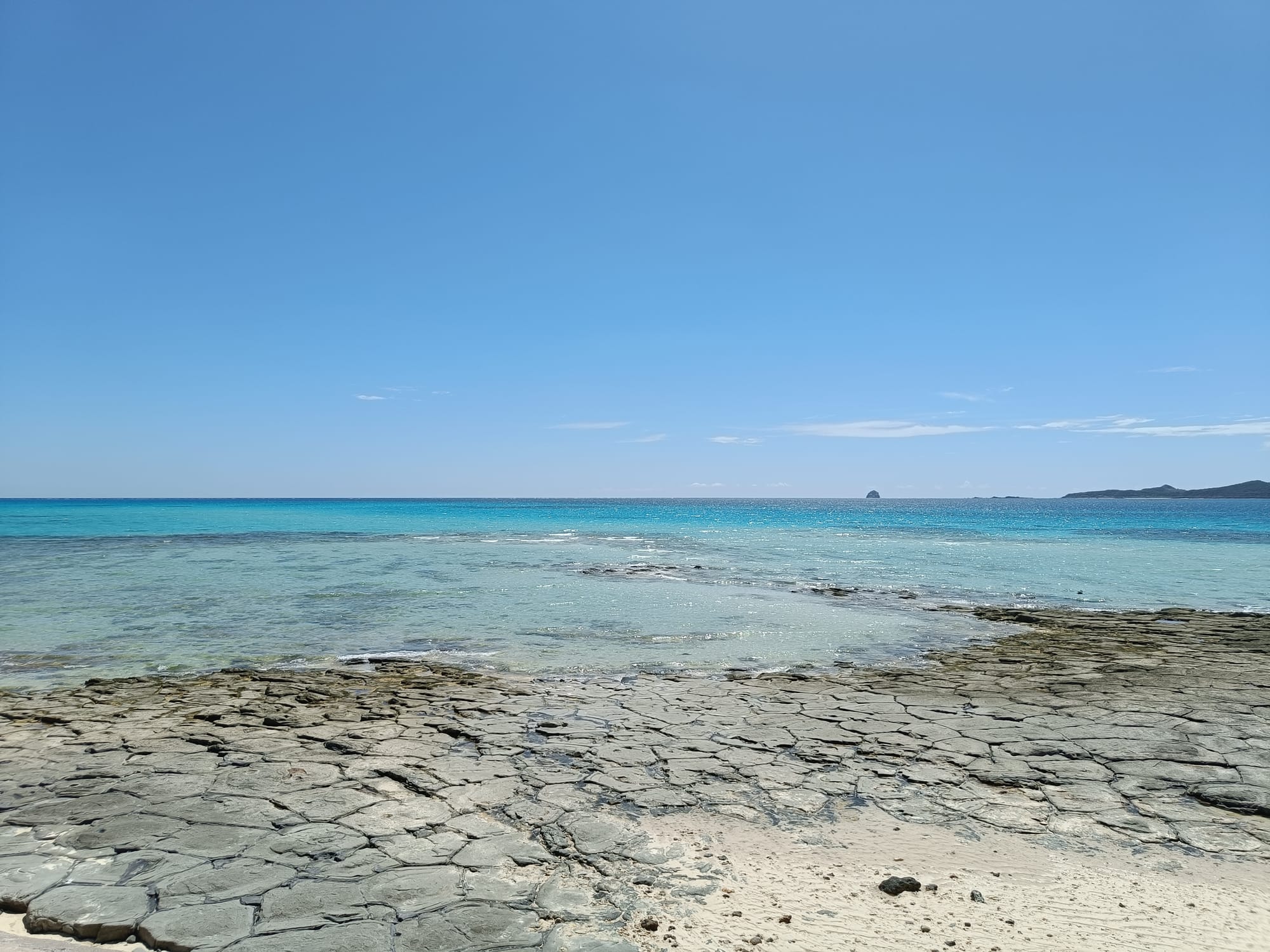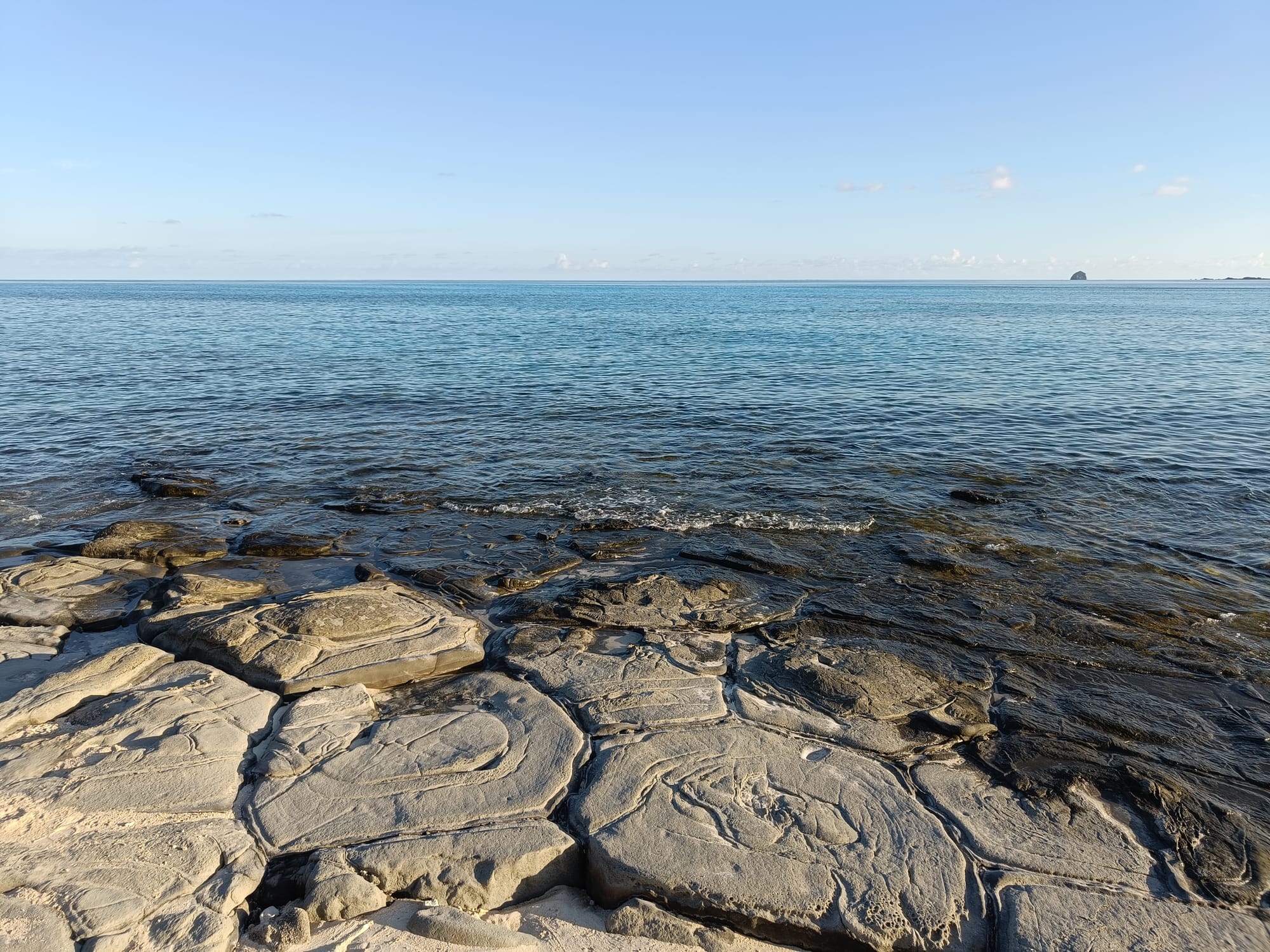 久米島、畳石。約600万年前の火山活動によって形成された柱状節理の断面が、波浪によって侵食されて、現在のような地形が作り出されている。