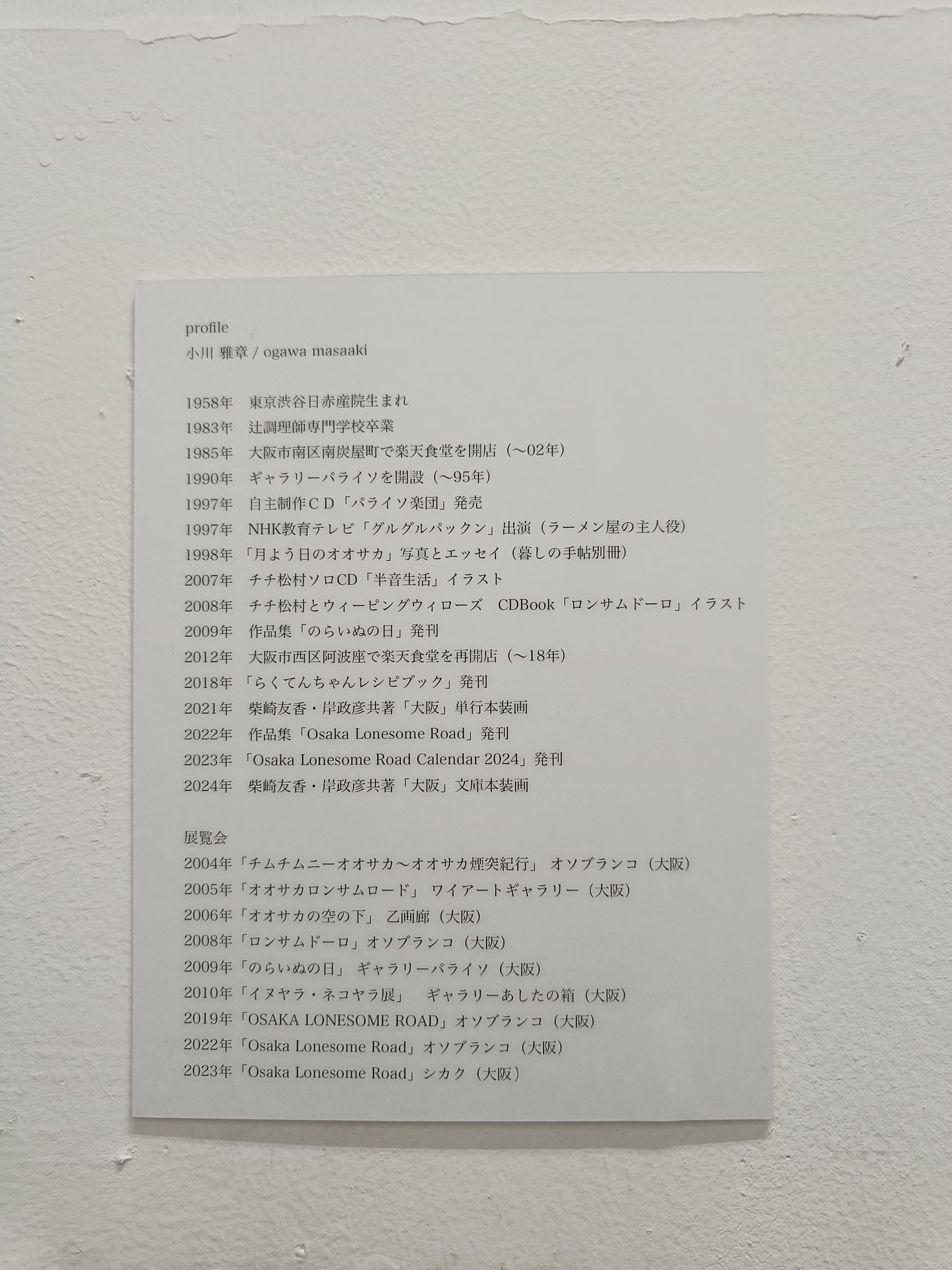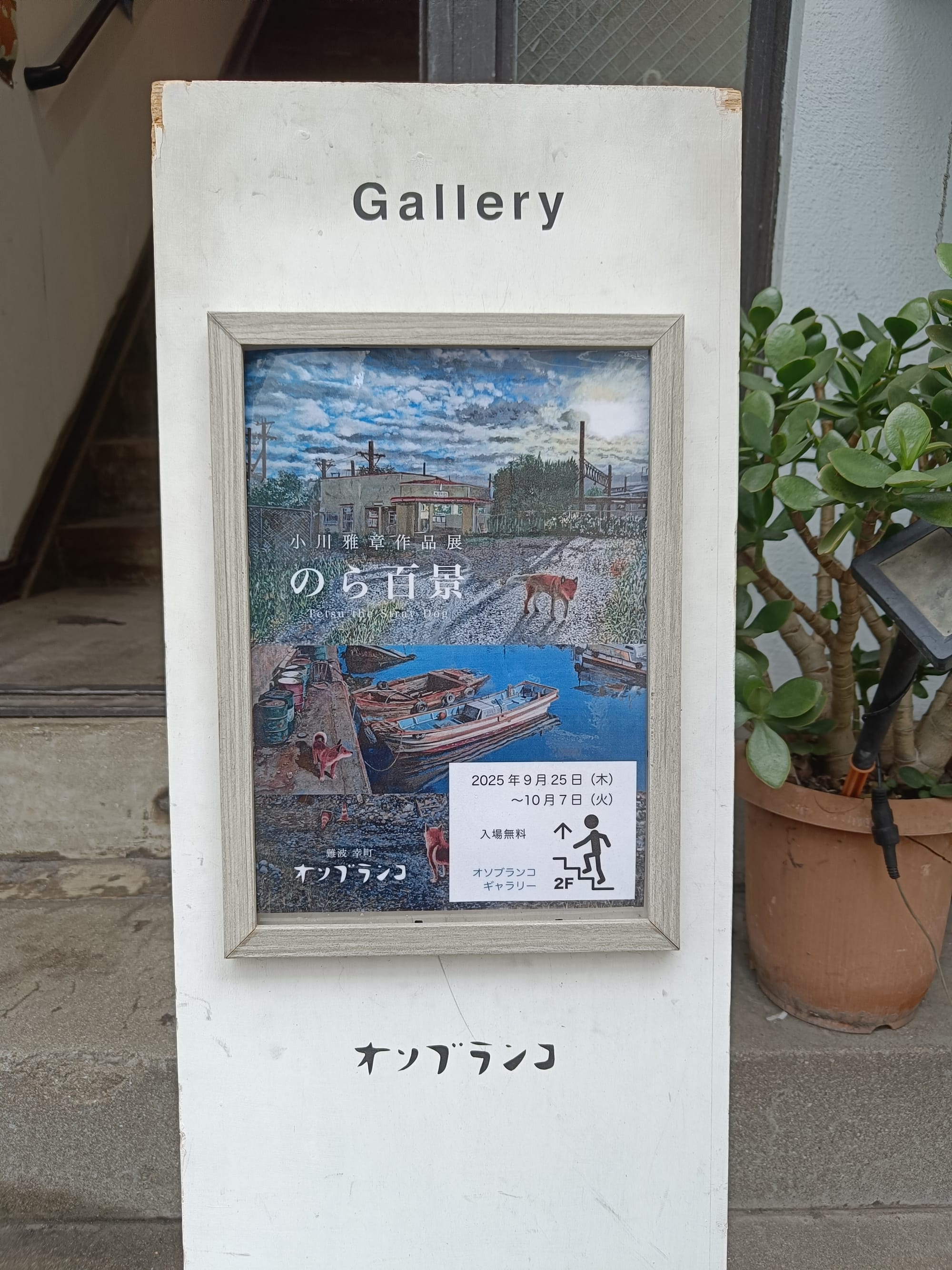 とはいえ、作品展の詳細はわからなかった。今思えば、小川さんに直接お尋ねすればよかったのかもしれないが、面識がなかったので遠慮してしまった。そして、「秋口」という言葉から、会期はおそらく9月末~10月頭だろうと予測して、やや賭けに出る形で往復の日程を決めたのだった。果たして賭けは見事に的中した。小川さんの作品展「のら百景」は、私の日本滞在期間にぴったり重なっていた。そうして久米島から大阪へ移動した翌々日、友人とともに会場の オソブランコを訪れた。