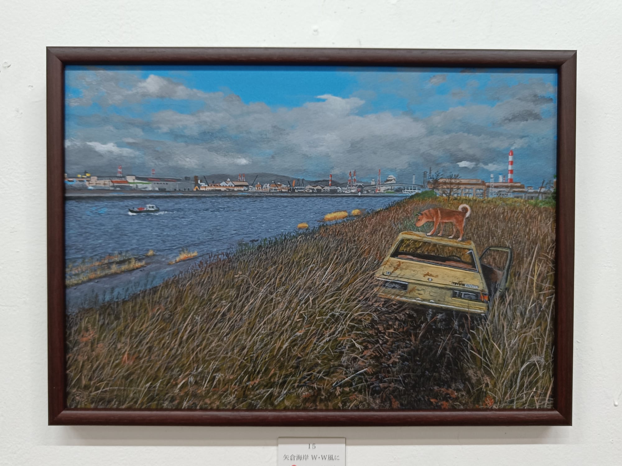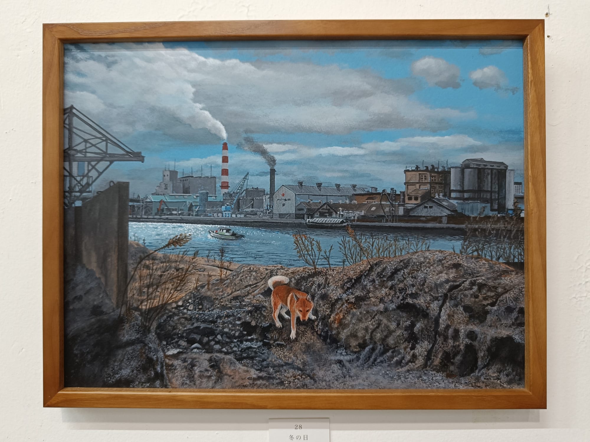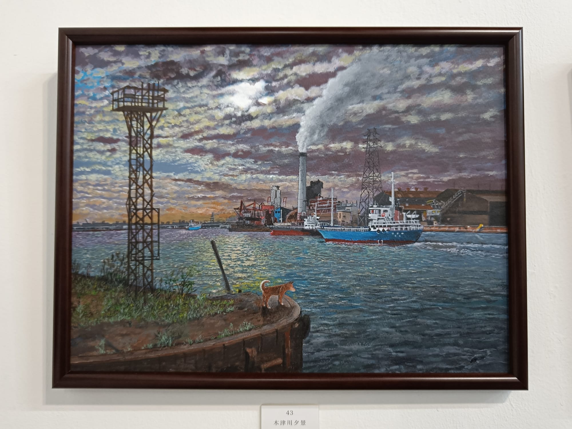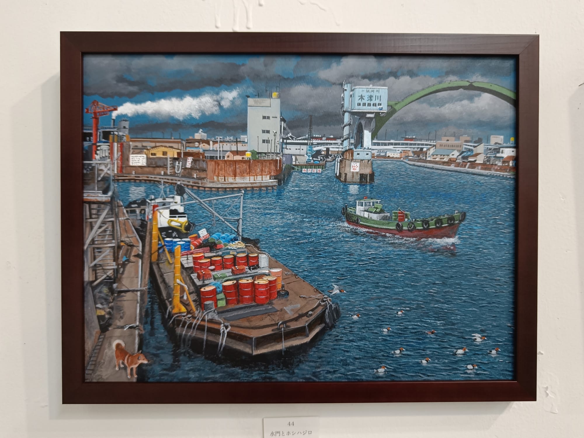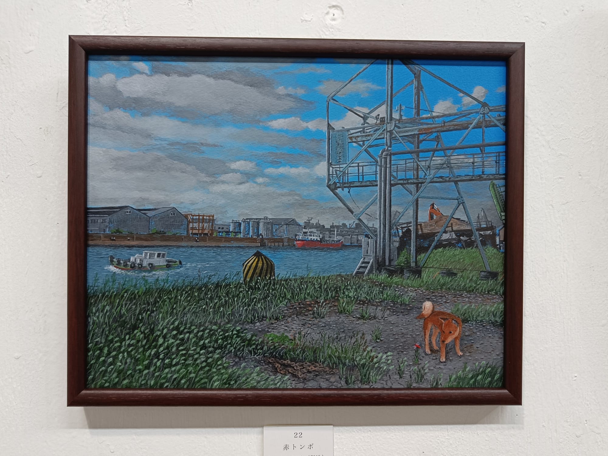 小川さんは、30年ほど前の大阪の湾岸地域の風景を描き続けておられる。そして、どの絵の中にも犬の「テツ」くんが登場する。私は大阪生まれではないけれど、小川さんが描く大阪湾岸の風景にはなぜかしら懐かしさを覚える。川岸に建ち並ぶ工場、鉄材やロープが散らばる造船所、水面に丸太が浮かぶ貯木所、空き地に放置された廃車、両側に草が生い茂る線路・・・テツくんが彷徨う場所はどこも不思議な既視感を呼び起こし、まるで彼と一緒に歩いたことがあるような気分になってくる。