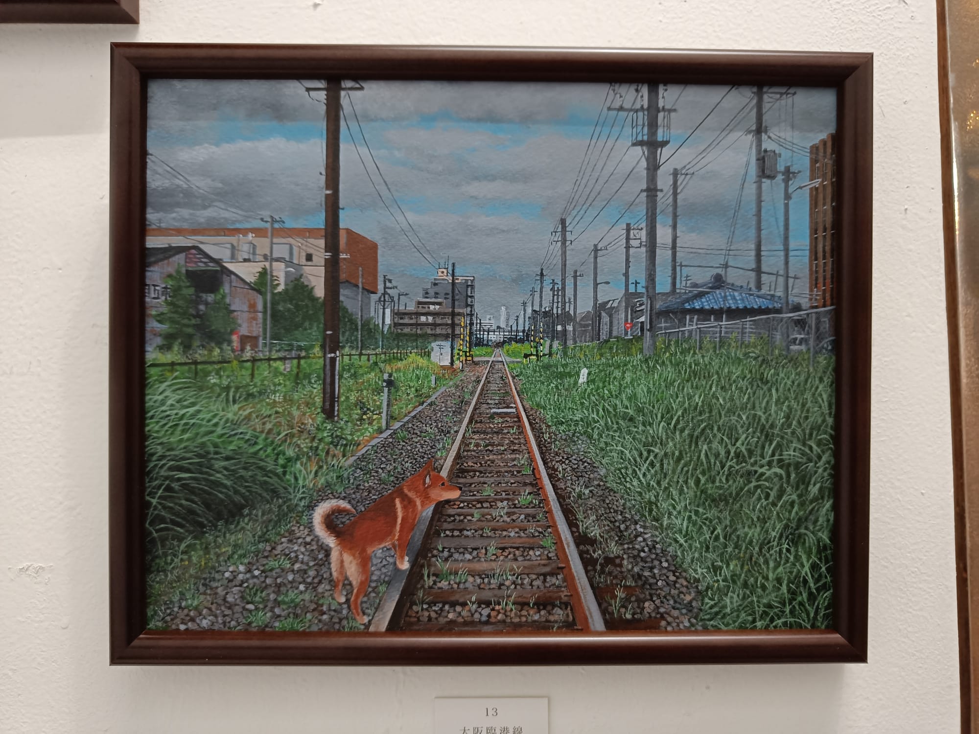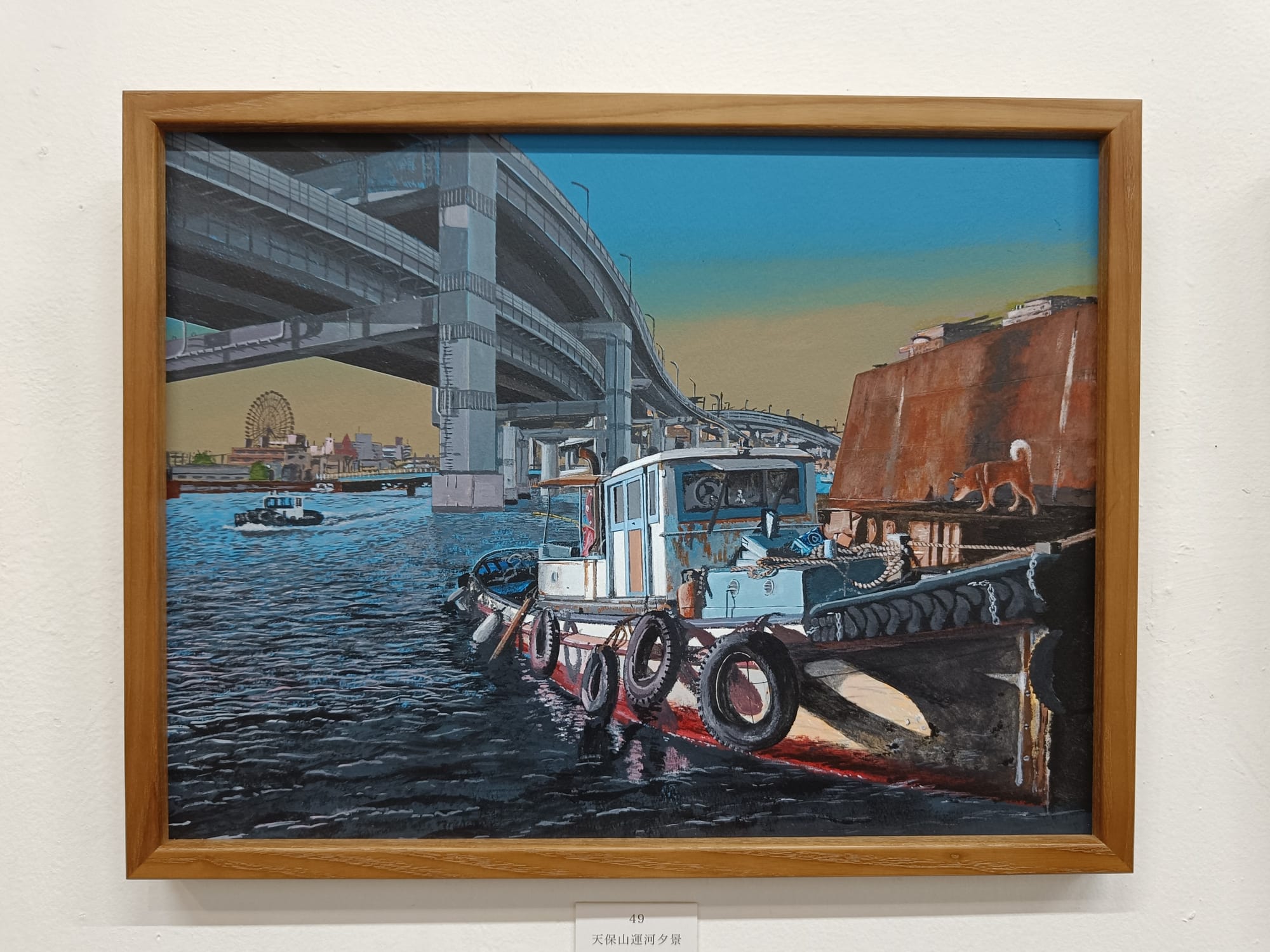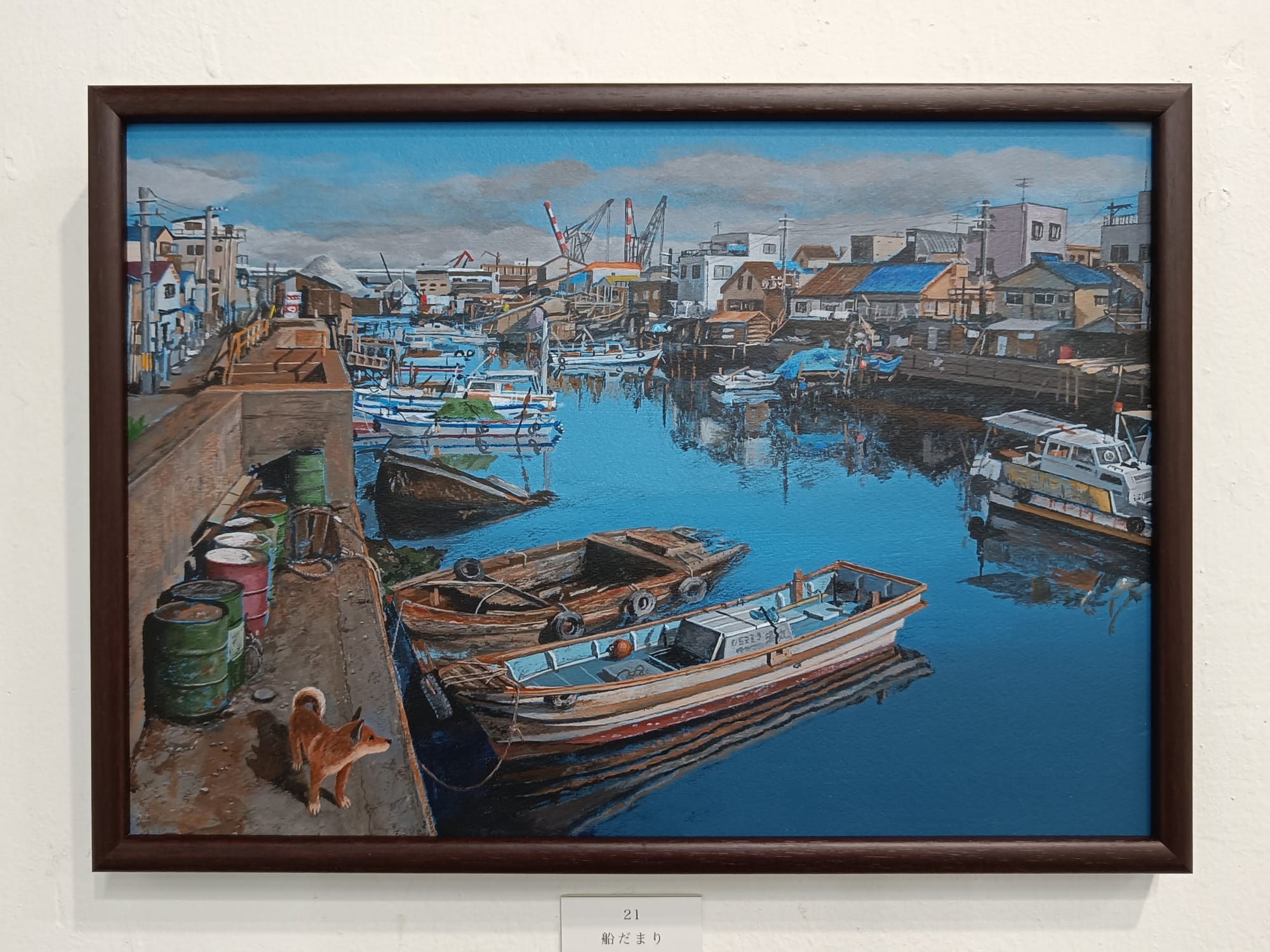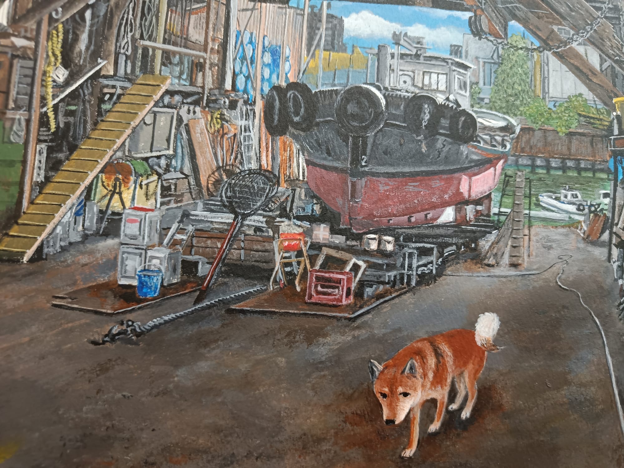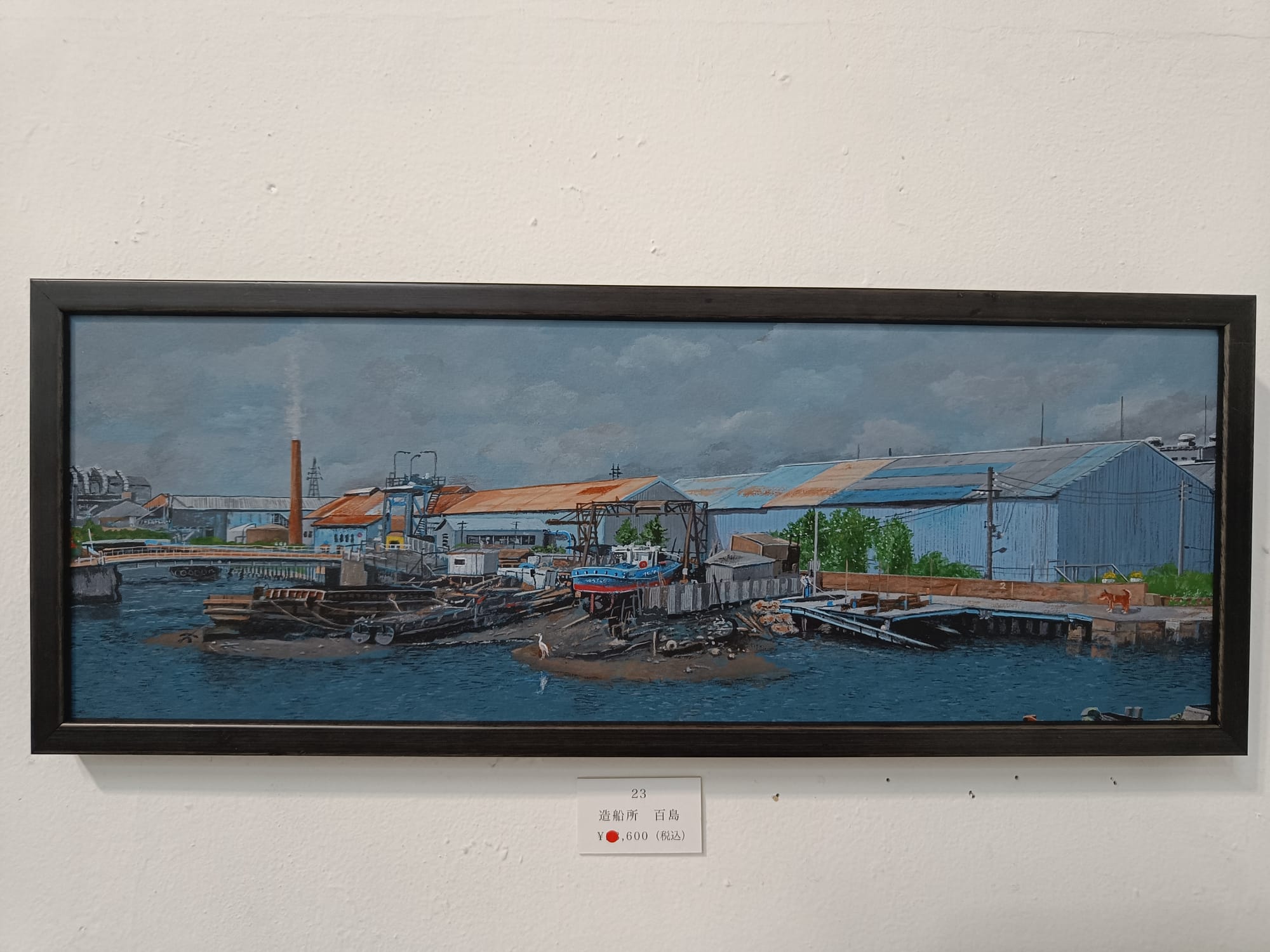 小川さんは、30年ほど前の大阪の湾岸地域の風景を描き続けておられる。そして、どの絵の中にも犬の「テツ」くんが登場する。私は大阪生まれではないけれど、小川さんが描く大阪湾岸の風景にはなぜかしら懐かしさを覚える。川岸に建ち並ぶ工場、鉄材やロープが散らばる造船所、水面に丸太が浮かぶ貯木所、空き地に放置された廃車、両側に草が生い茂る線路・・・テツくんが彷徨う場所はどこも不思議な既視感を呼び起こし、まるで彼と一緒に歩いたことがあるような気分になってくる。