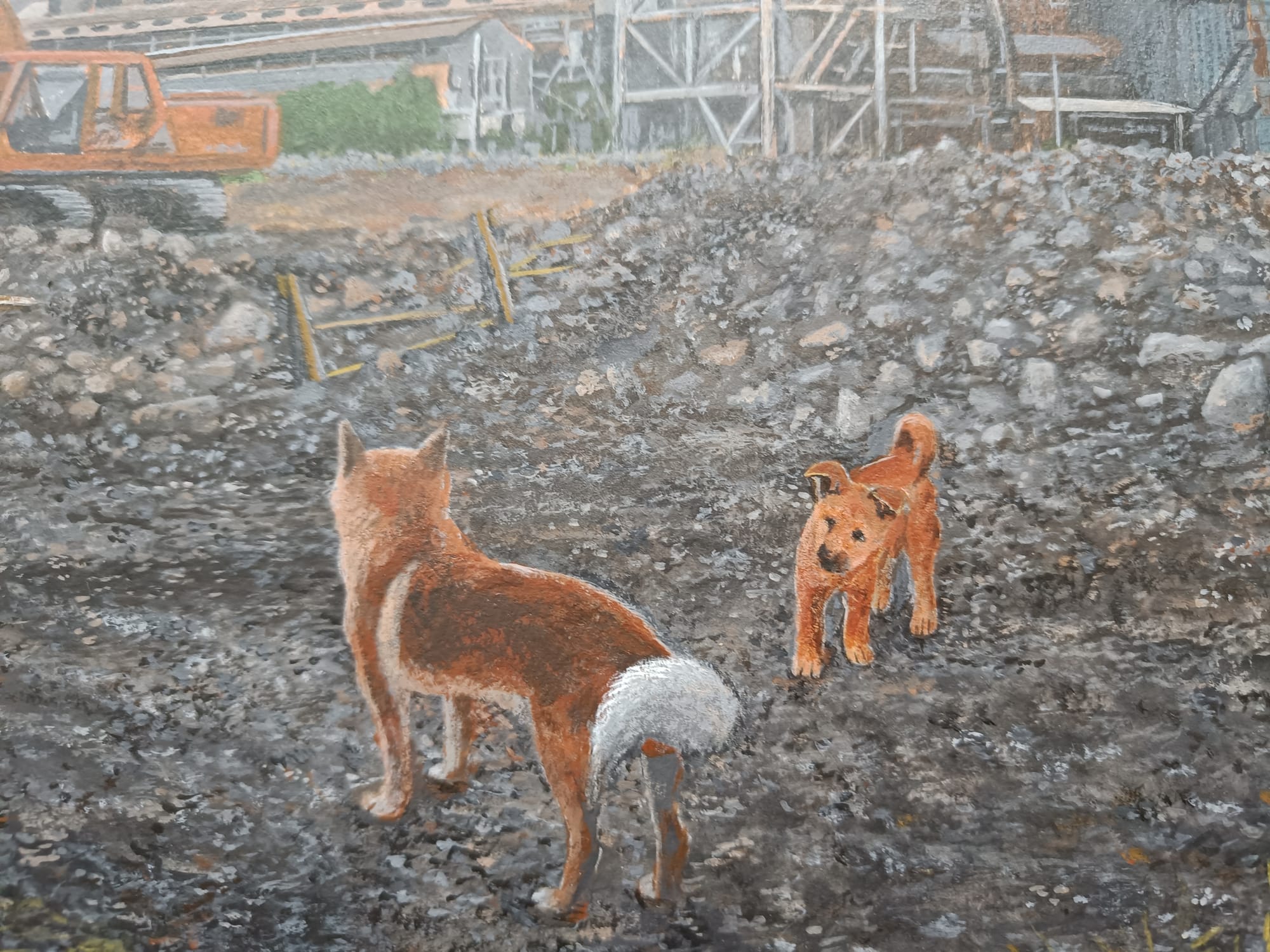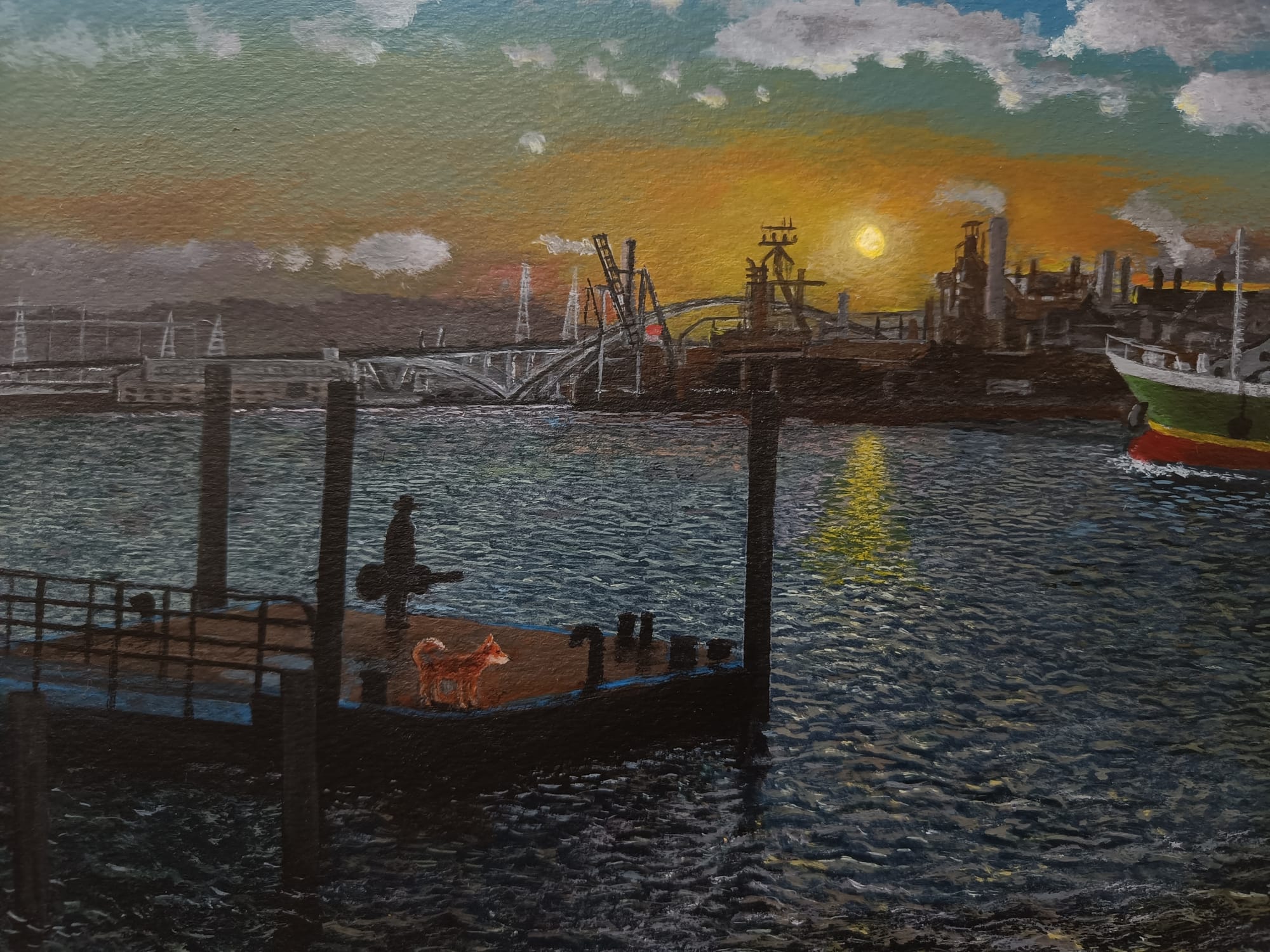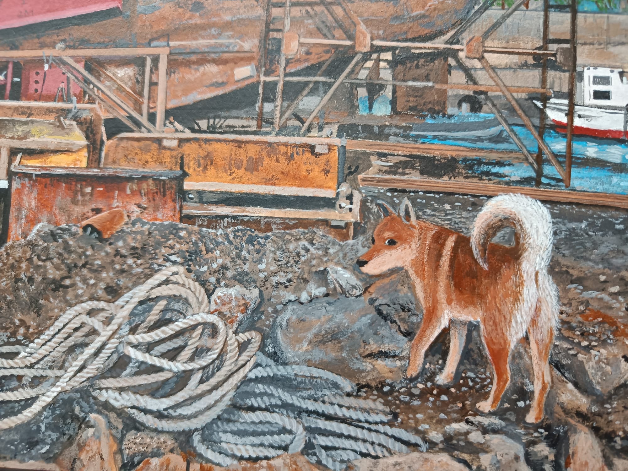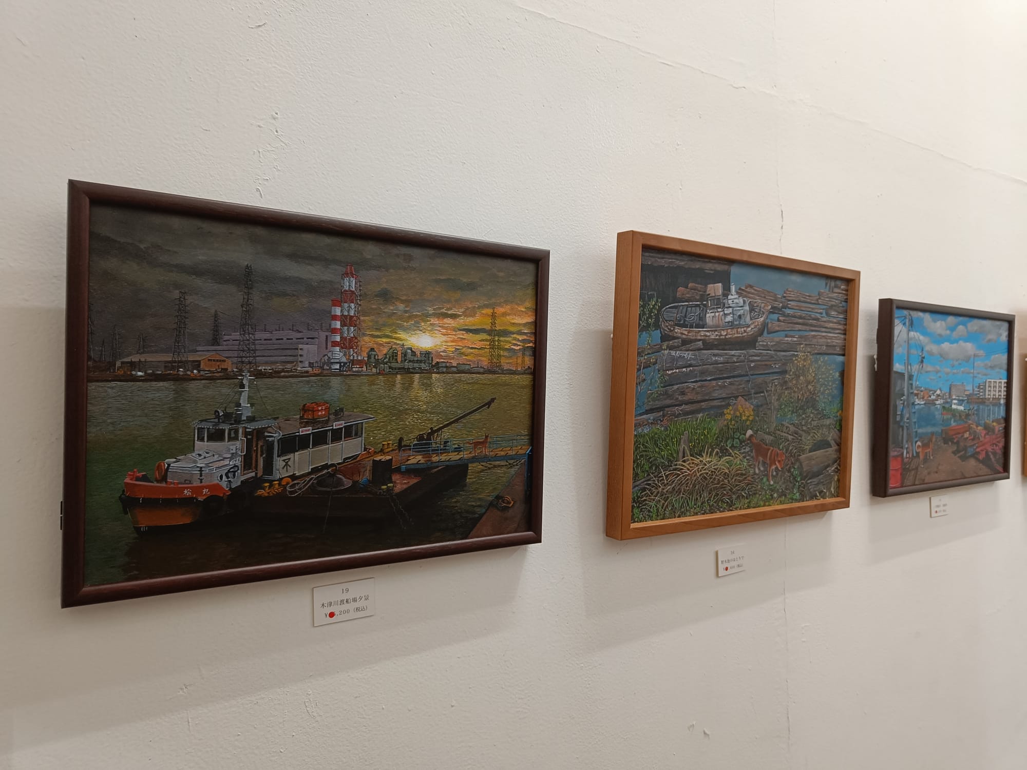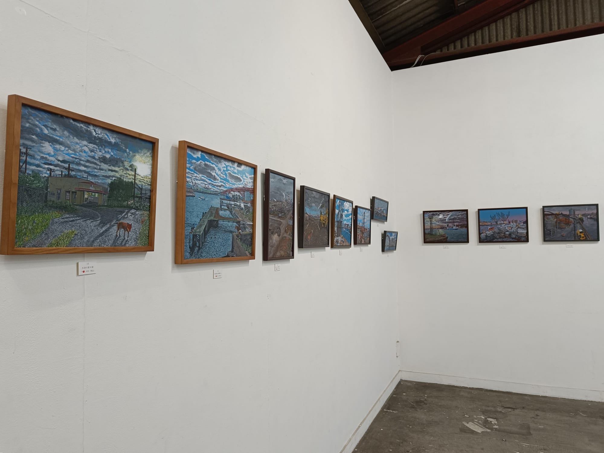 小川さんは、30年ほど前の大阪の湾岸地域の風景を描き続けておられる。そして、どの絵の中にも犬の「テツ」くんが登場する。私は大阪生まれではないけれど、小川さんが描く大阪湾岸の風景にはなぜかしら懐かしさを覚える。川岸に建ち並ぶ工場、鉄材やロープが散らばる造船所、水面に丸太が浮かぶ貯木所、空き地に放置された廃車、両側に草が生い茂る線路・・・テツくんが彷徨う場所はどこも不思議な既視感を呼び起こし、まるで彼と一緒に歩いたことがあるような気分になってくる。