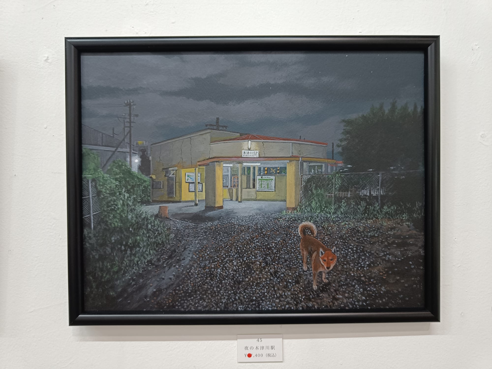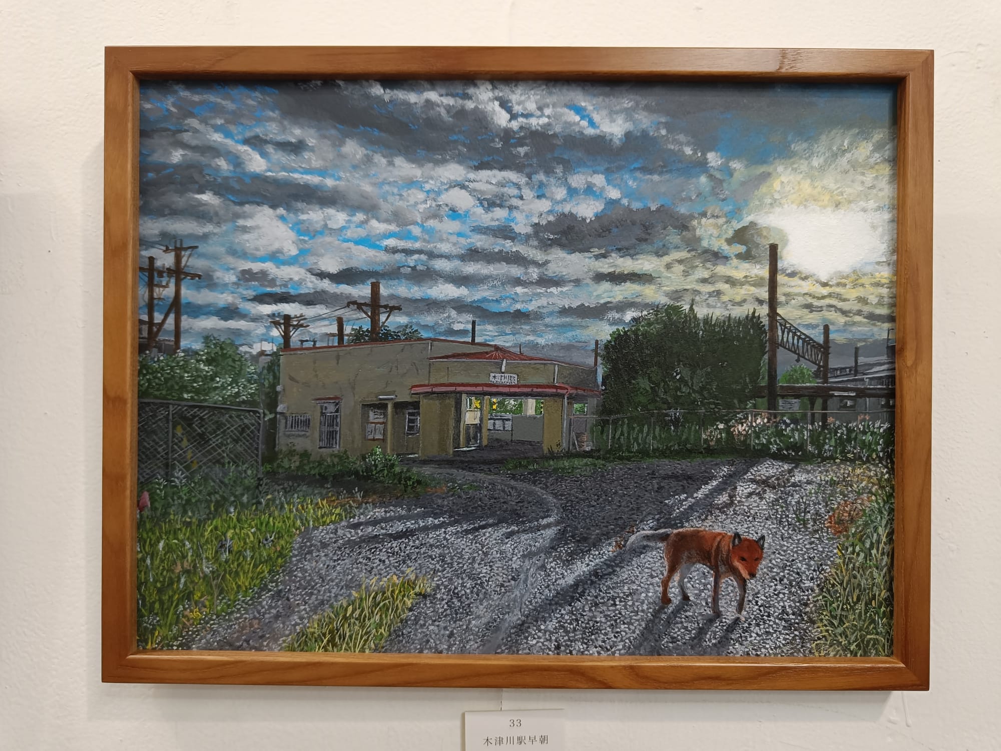 私が訪れたのは会期終了の数日前で、大半の作品にはすでに売約済みの印がついていた。「わかる、これは欲しくなるよ」と思いながら、52点の作品を一つ一つじっくり見て回った。そして、ある一枚の絵を見た瞬間、心が鷲掴みにされた。《西島夕景》と題されたその絵は、他の作品よりもグレイッシュで、川辺に佇むテツくんの背中からは孤独の寂しさすら感じられた。しかし、よく見ると対岸には白い鷺がいて、雲間から覗く空には柔らかな色彩があり、ただ寂寥感だけではない叙情と物語があった。