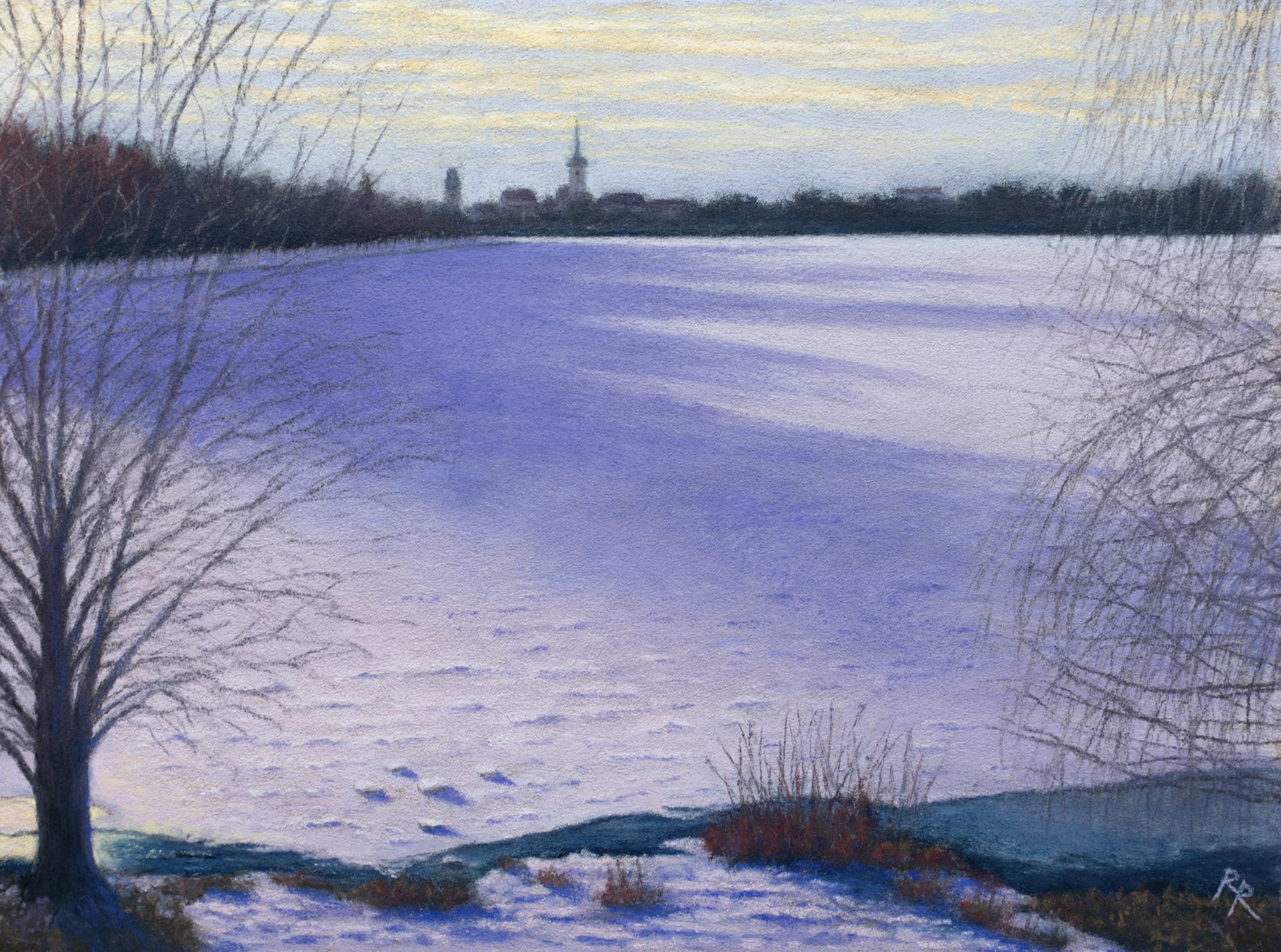 This is a winter scene of the nearby lake where I often used to walk with my late beloved dog. At the time, the lake was completely frozen and covered in snow, and the setting sun cast beautiful shadows across it. I wanted to give form to this scene, which is filled with precious memories for me. I have reworked this landscape several times, changing its size and the support material, and I hope that this version turned out to convey a slightly more spacious sense and atmosphere than the one I posted previously.