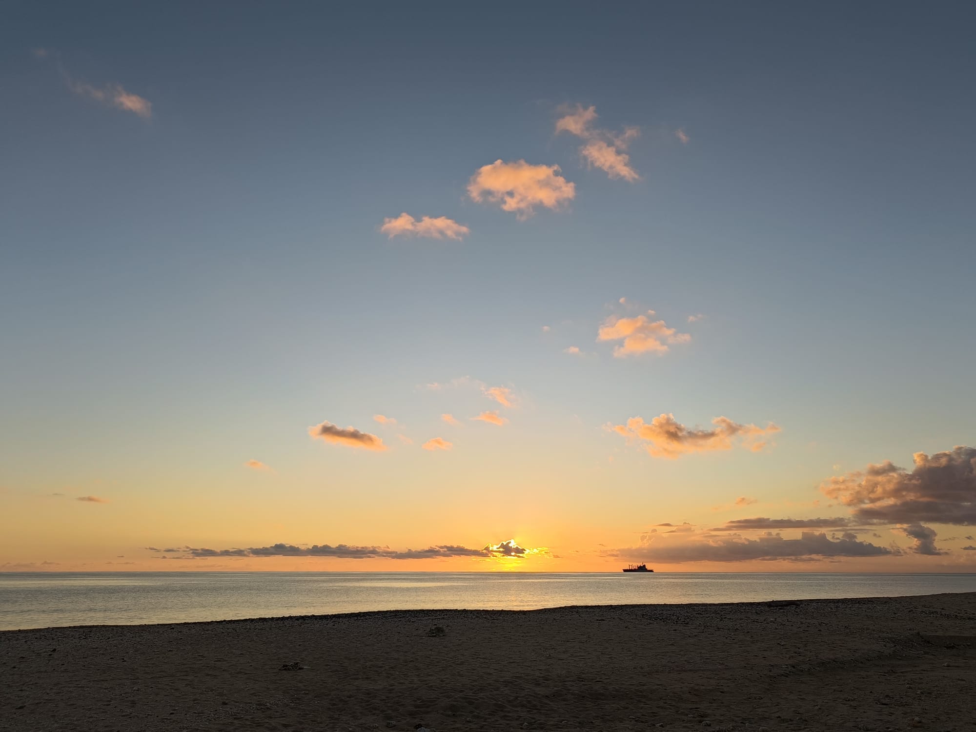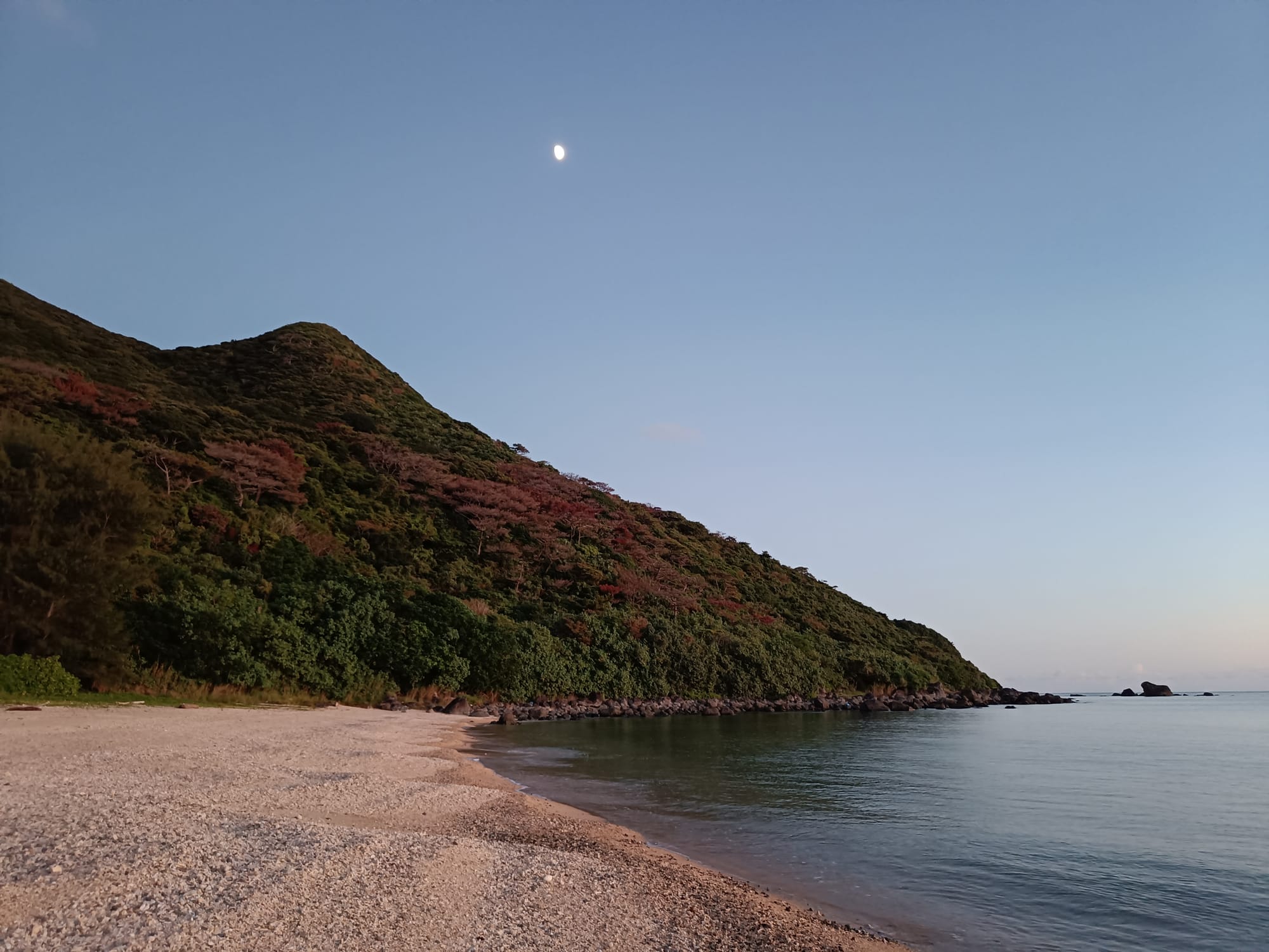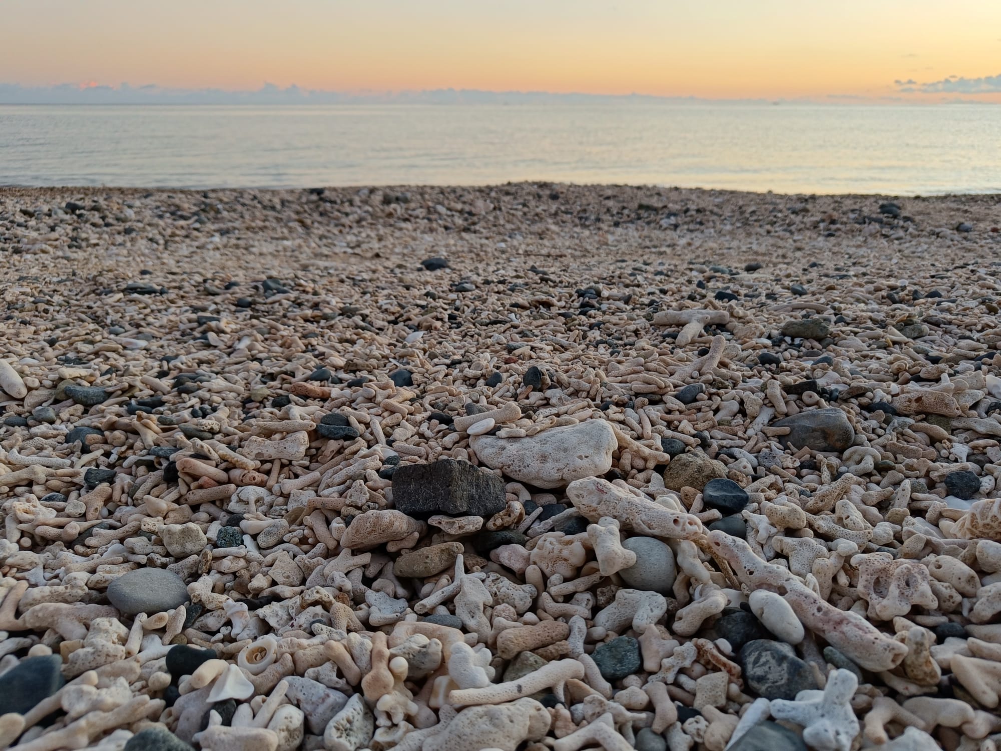 久米島の南西部にあるアーラ浜は、珊瑚や貝殻に覆われていて、足を踏み出すたびにカラカラと音が鳴り、波が寄せては返すたびにシャラシャラとした音が響く。