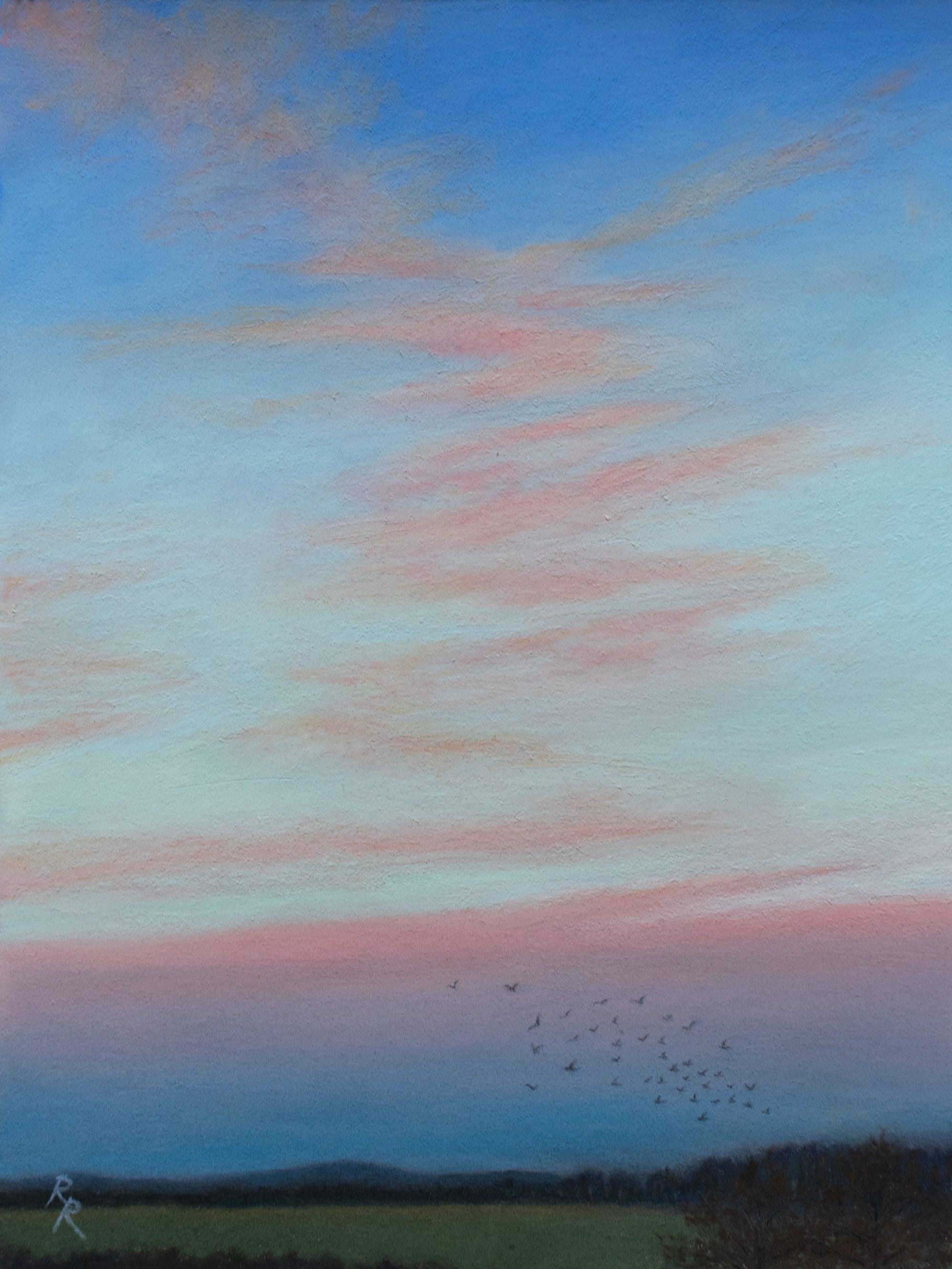 The Northern Sky around 5:45 pm 28/02/2026Pastel on Pastelmat 18x24 cm15分ほどで急いで描きとめたスケッチの細部を少し整え、実際に飛び回っていた鳩の群れも描き加えた。 Share