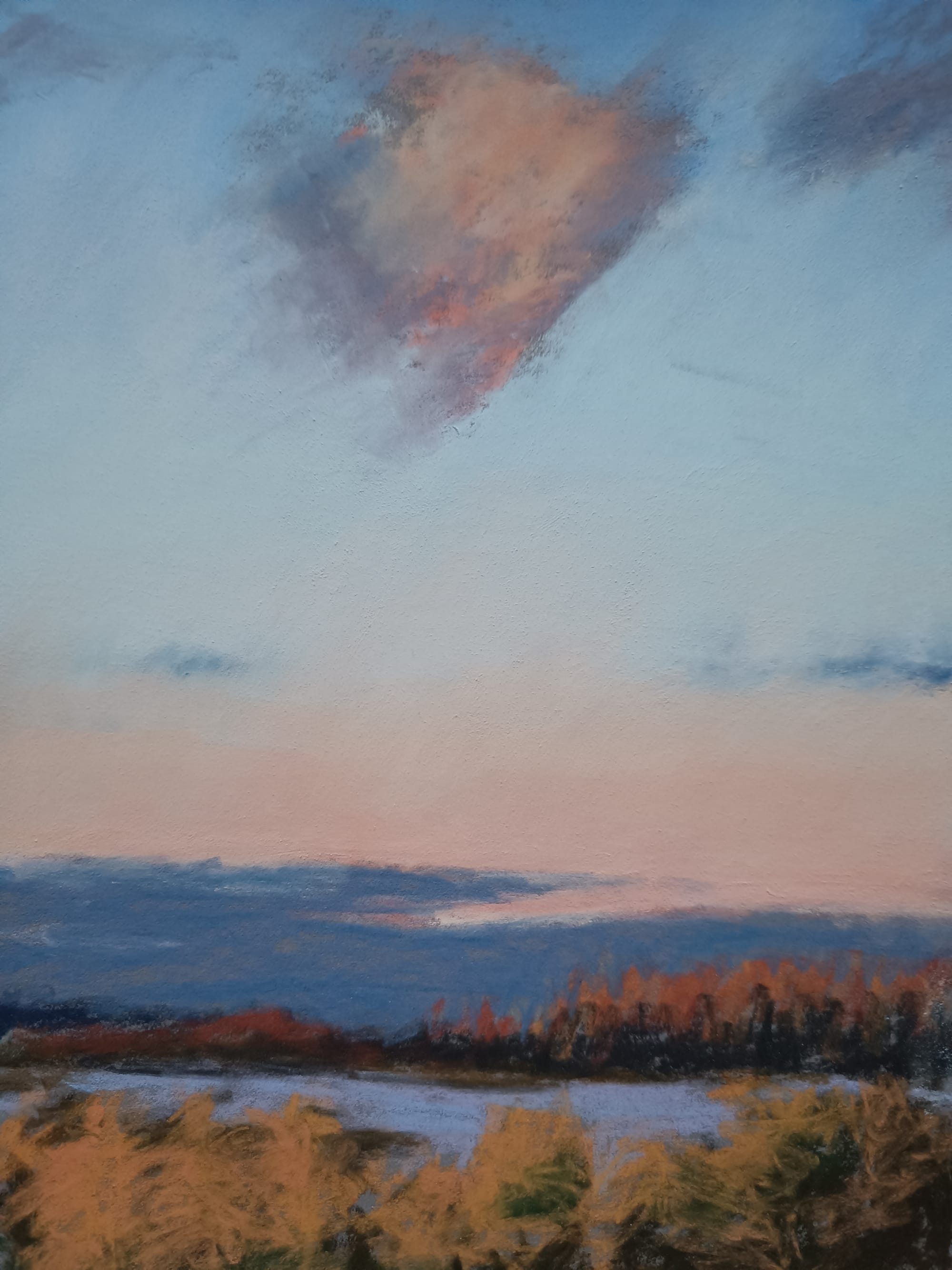 The Northern Sky Shortly after 4pm Today15-minute pastel sketch through the windowI attempted to capture a very brief moment's colours, when the setting sun dyed the trees gold.今日午後4時過ぎの北の空、約15分間のパステルスケッチ。夕日が木々を黄金色に染めた束の間の色彩を捉えたくて、大急ぎで描いた。 Share